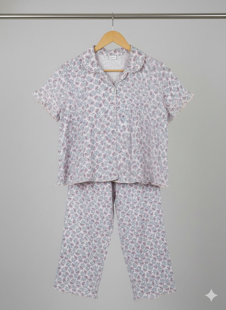Immerse yourself in serene comfort with our Hydrangea Blue PJ Set. This lovely loungewear features a calming, soft blue hue, reminiscent of delicate hydrangea blooms, with a subtle textured or striped pattern. The classic short-sleeved, button-down top with a notched collar pairs perfectly with comfortable, full-length pants, creating an effortlessly elegant look.